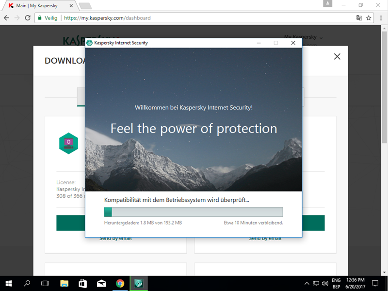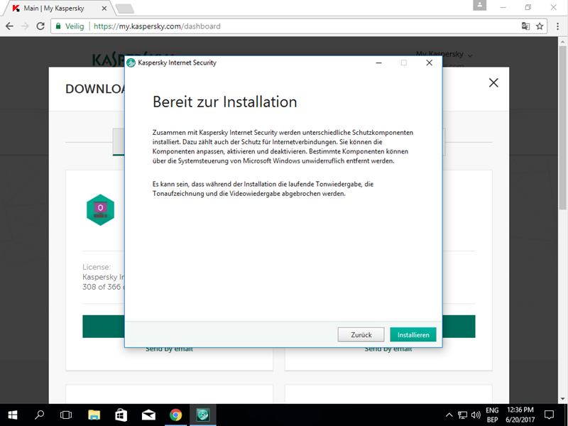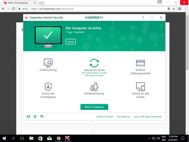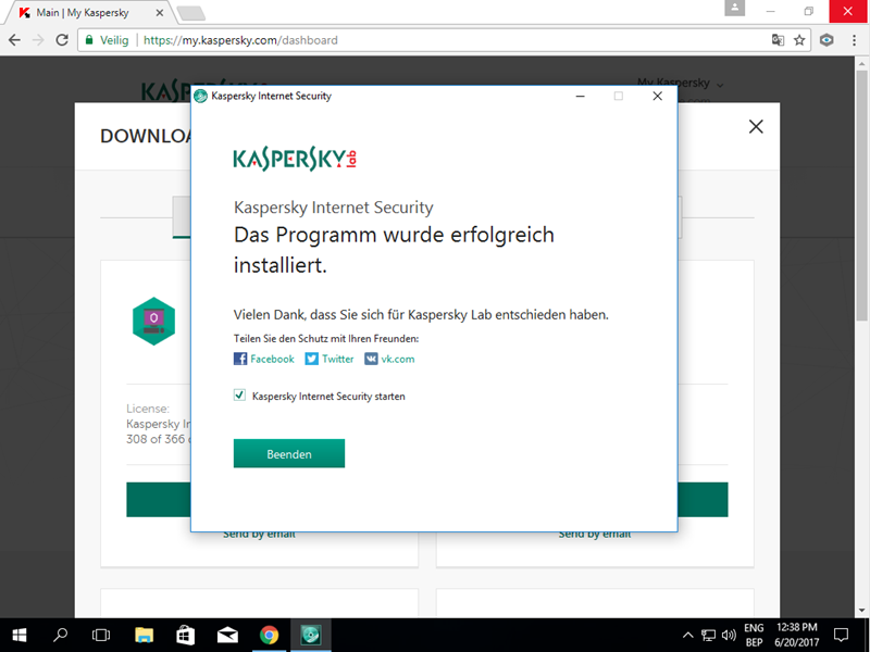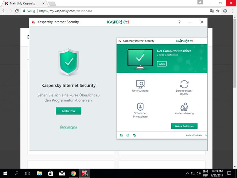 1 Besuchen Sie http://my.kaspersky.com/MyDevices Klicken Sie auf die Registerkarte 'Geräte', anschließend klicken Sie bitte auf 'Neues Gerät schützen'. 2 Kaspersky Internet Security unter der Windows-Registerkarte herunterladen. 3 Klicken Sie auf 'Fortsetzen'. 4 Klicken Sie auf 'Installieren'. 5 Warten Sie, bis die Installation abgeschlossen ist. 6 Klicken Sie auf 'Beenden'. 7 Wenn Sie eine kurze Anleitung sehen möchten, klicken Sie bitte auf 'Fortsetzen', wenn Sie die Anleitung nicht sehen möchten, klicken Sie auf 'Überspringen'. Die Installation ist abgeschlossen.
