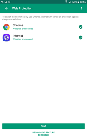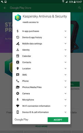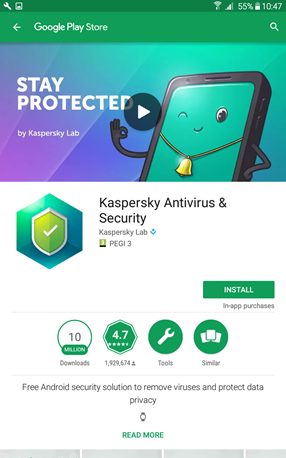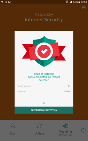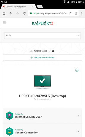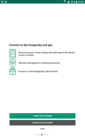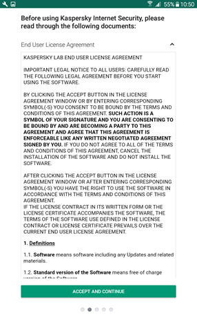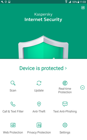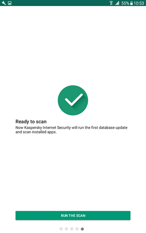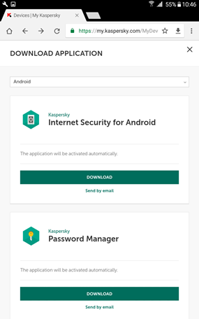 1 Sign in. On your device go to http://my.kaspersky.com and sign in. 2 Click ‘Protect New Device’. 3 Under Internet Security For Android click ‘Download’. 4 The Google Play Store will be opened, click ‘Install’. 5 Click ‘Accept’. 6 Choose your country. After the installation start the Internet Security app. Choose your country and click ‘Next’. 7 Read the license agreement and click ‘Accept And Continue’. 8 Click ‘I Have An Account’ to log in. 9 Select the your product code. 10 Click ‘Run The Scan’ to preform an initial scan. 11 Click ‘Ok’ OR ‘Recommend Protection’ to apply standard protections. 12 The installation is complete. 13 To activate Web Protection click the Arrow for more options and choose Web Protection. 14 Click ‘Continue’. Click ‘Done’.