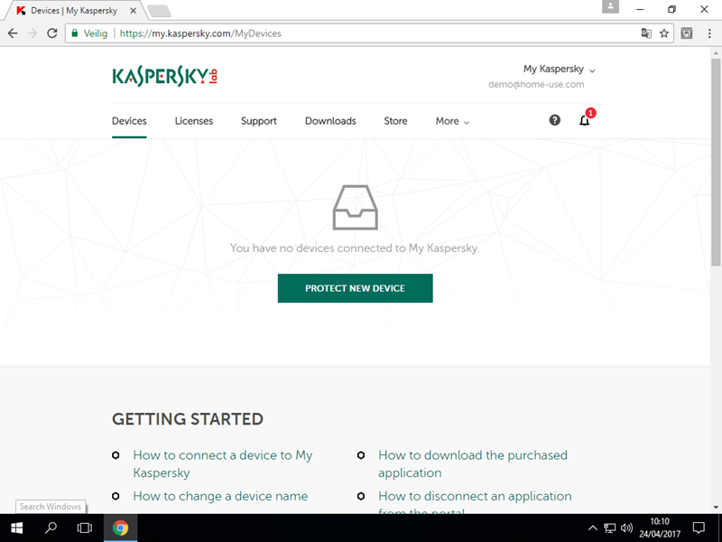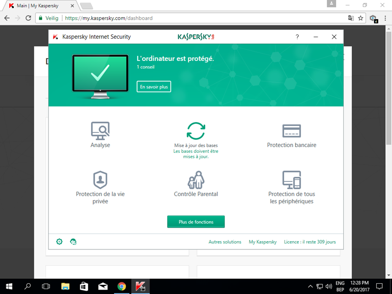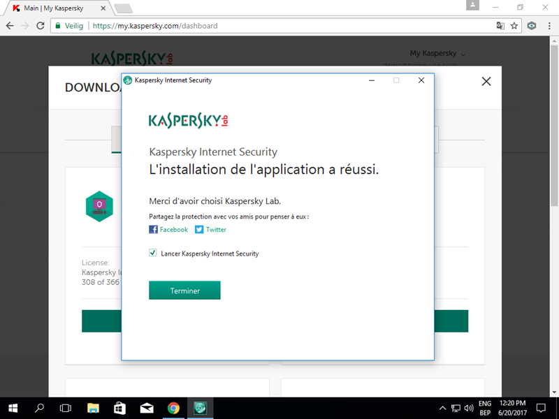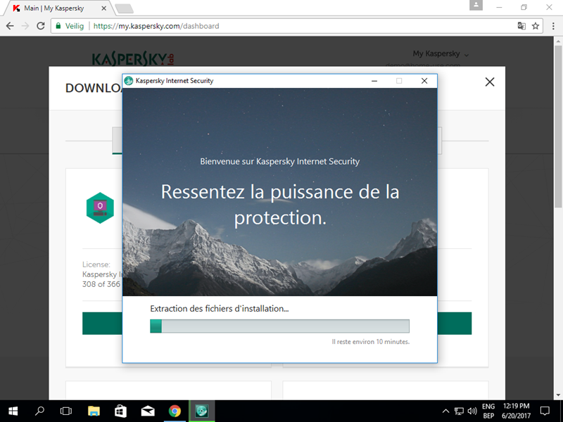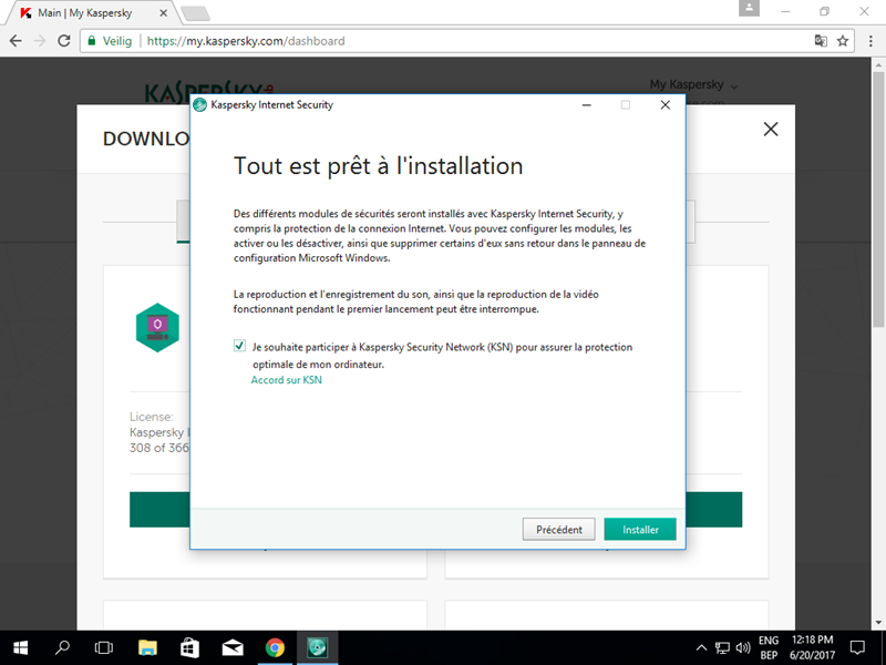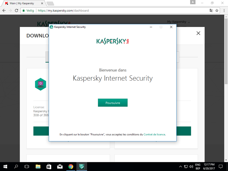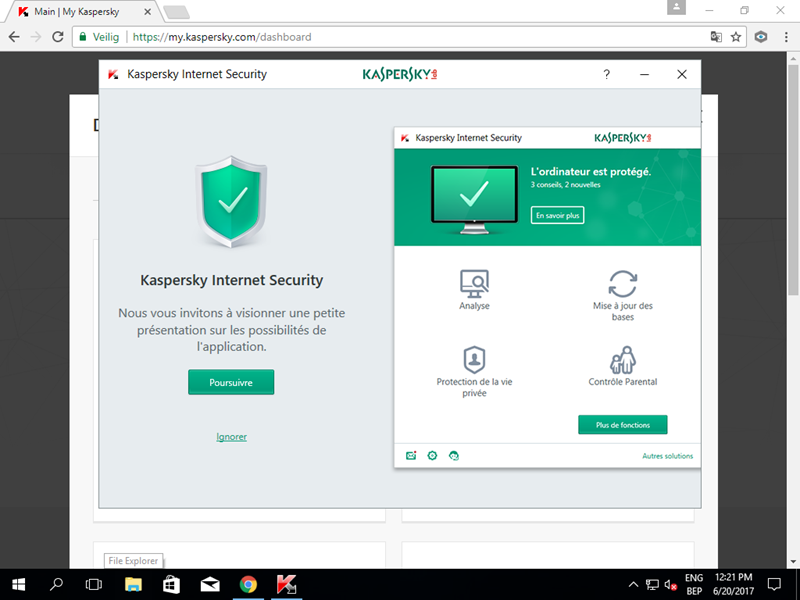 1 Prenez http://my.kaspersky.com/MyDevices Cliquez sur l’onglet «Se Connecter», puis cliquez sur « protéger le nouvel appareil». 2 Télécharger Kaspersky Internet Security dans l’onglet Windows. 3 Cliquez sur « Poursuivre ». 4 Cliquez sur « installer ». 5 Attendez jusqu’à ce que l’installation soit terminée. 6 Cliquez sur « terminer ». 7 Cliquez sur « Poursuivre » pour une courte visite ou sur « Ignorer » si vous ne souhaitez pas faire le tour. L’installation est terminée.
